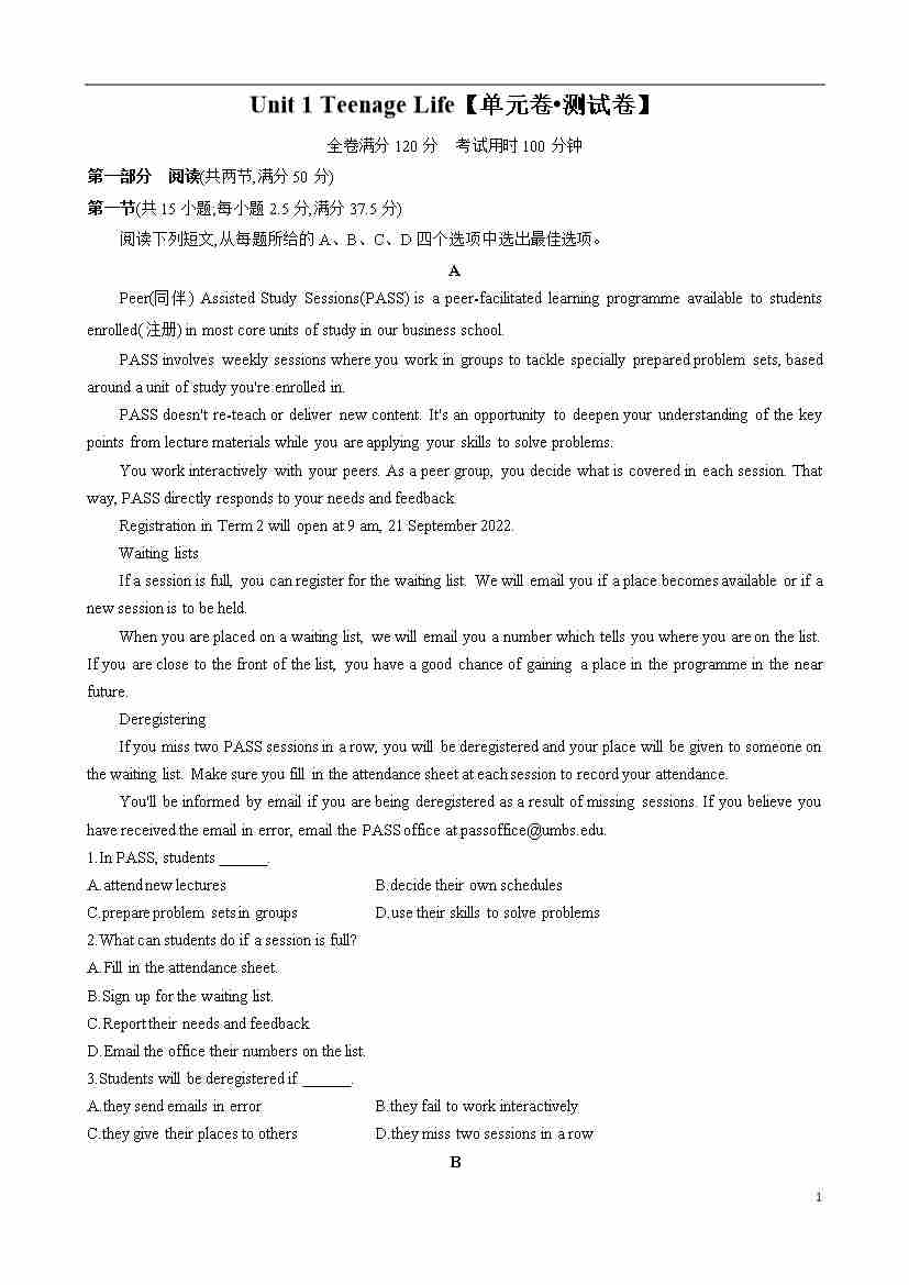 首页 > 全部 > 单元提升卷 > Unit1 Teenage Life【单元卷•测试卷】-2024-2025学年高一英语单元速记•巧练(人教版2019必修第一册)(原卷版)