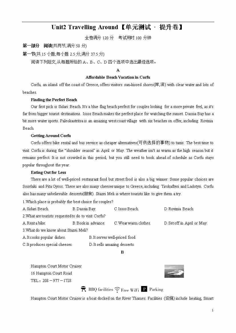 首页 > 全部 > 单元提升卷 > Unit2Travelling Around【单元测试 · 提升卷】(解析版)