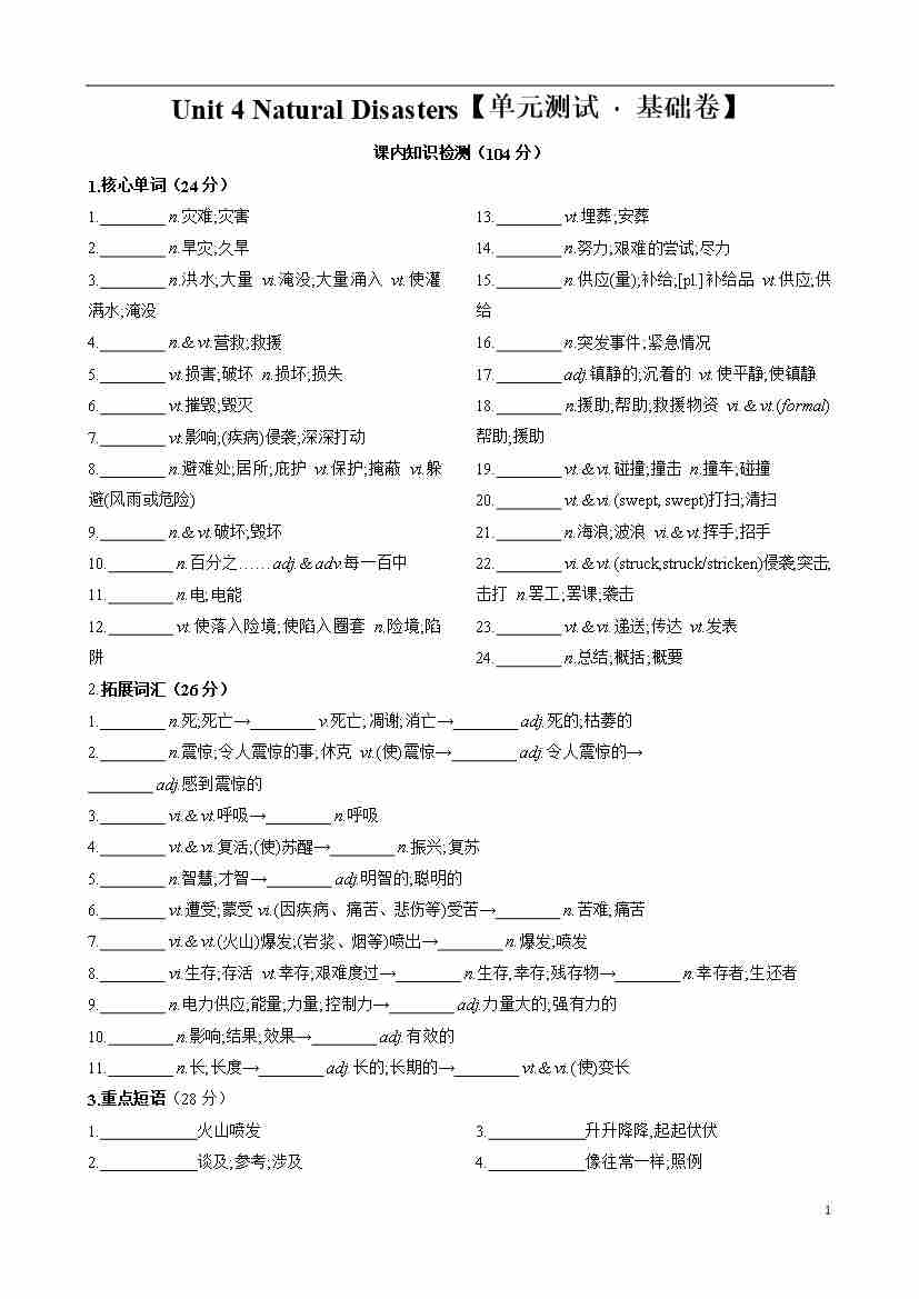首页 > 全部 > 单元提升卷 > Unit 4 Natural Disasters【单元测试 · 基础卷】(原卷版)
