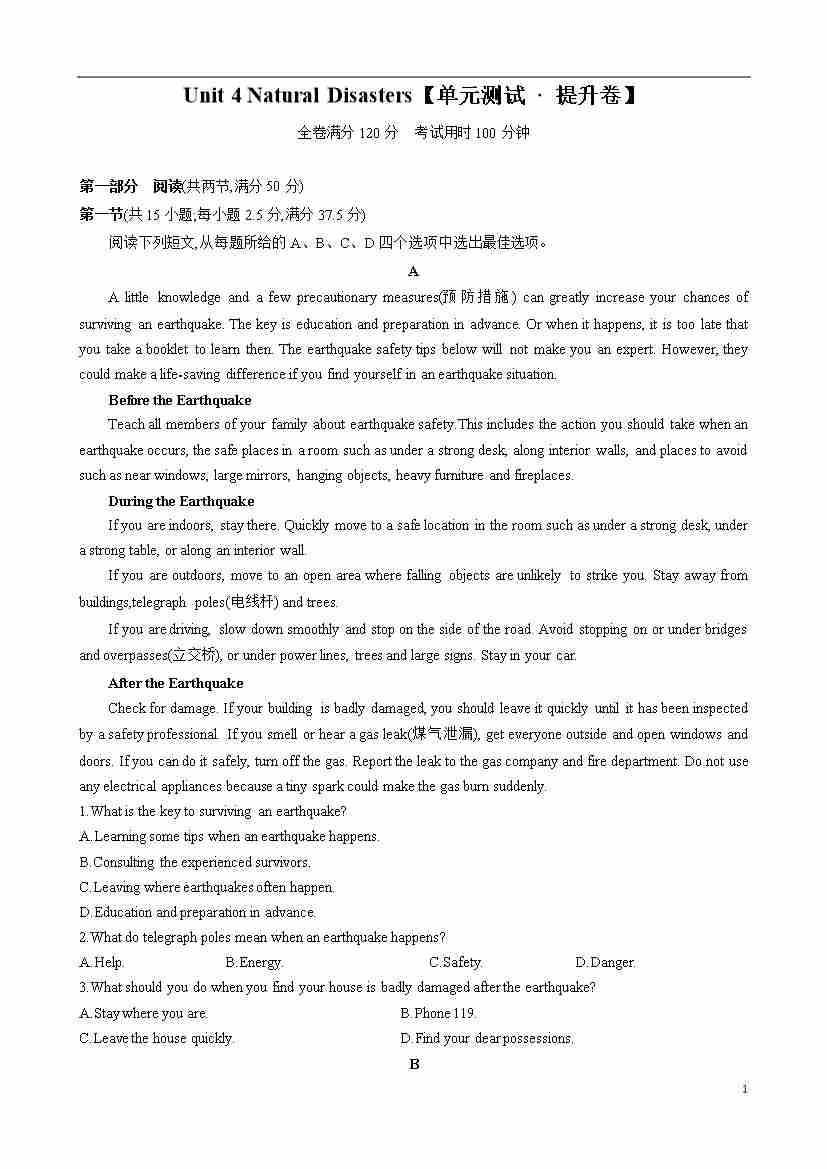 首页 > 全部 > 单元提升卷 > Unit 4 Natural Disasters【单元测试 · 提升卷】(原卷版)