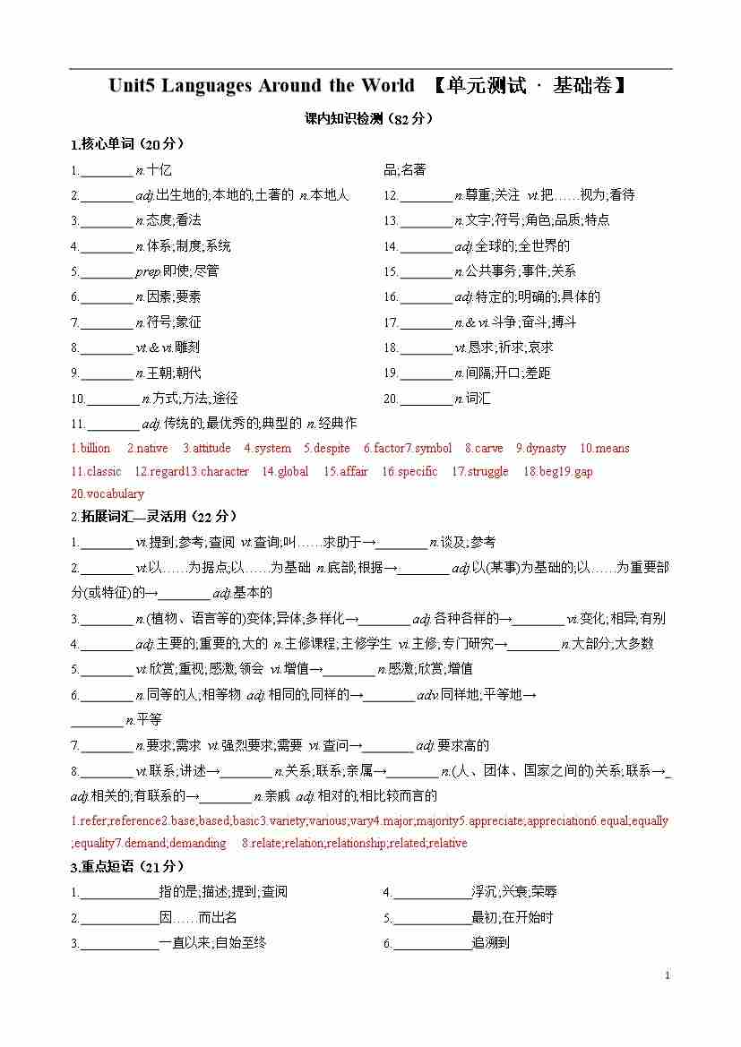 首页 > 全部 > 单元提升卷 > Unit 5 Languages Around the World【单元测试 · 基础卷】(解析版)