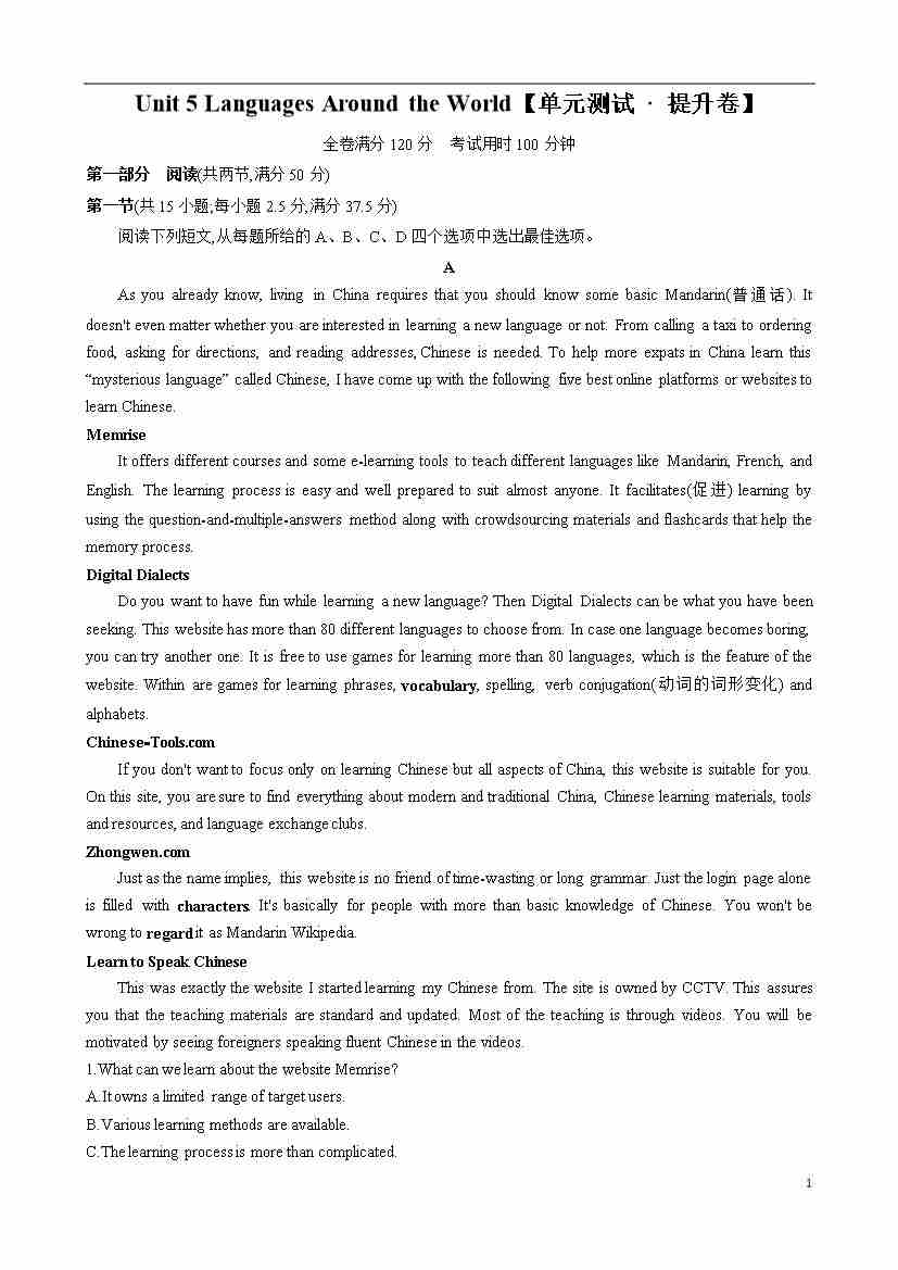 首页 > 全部 > 单元提升卷 > Unit 5 Languages Around the World【单元测试 · 提升卷】(原卷版)