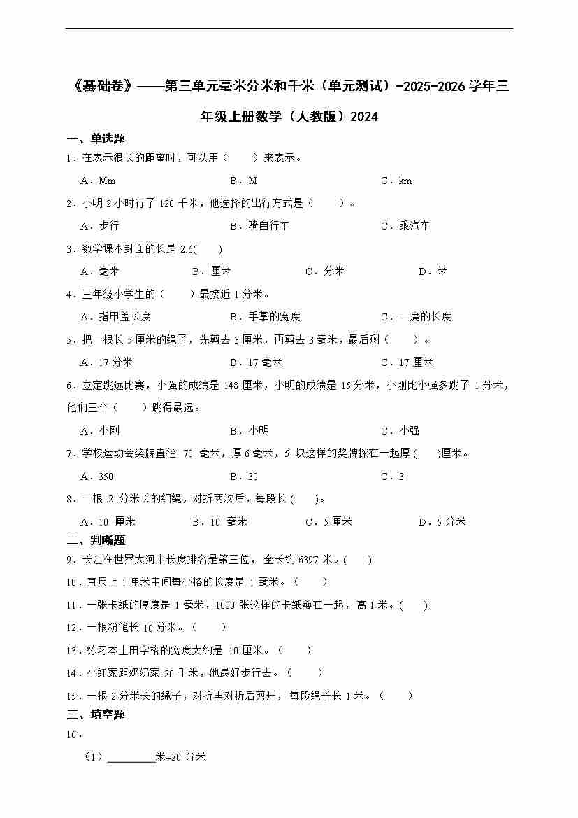 首页 > 全部 > 单元测试 > 《基础卷》——第三单元毫米分米和千米(含解析)