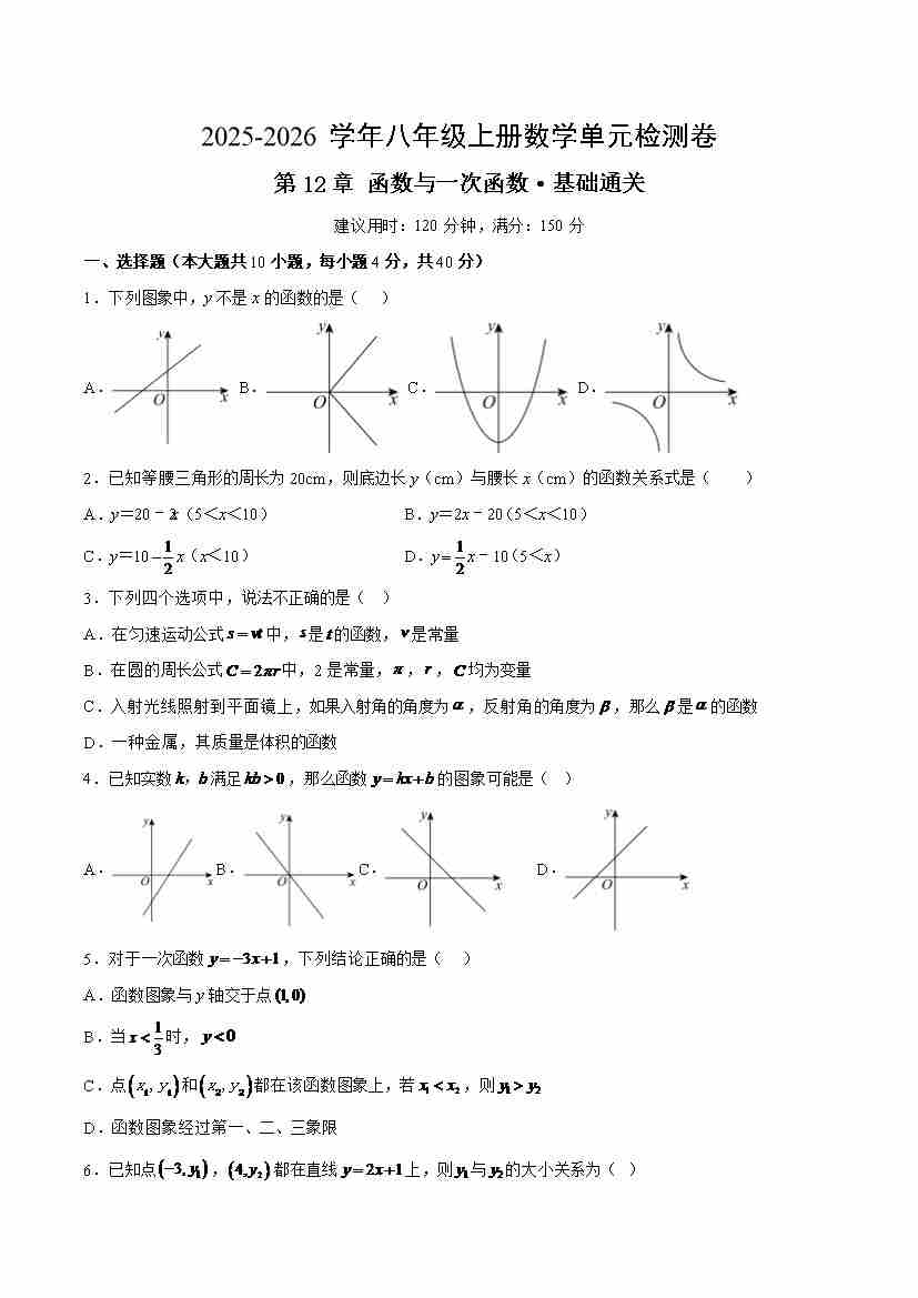 首页 > 全部 > 单元基础卷 > 第12章 函数与一次函数测试·基础卷(考试版A4)