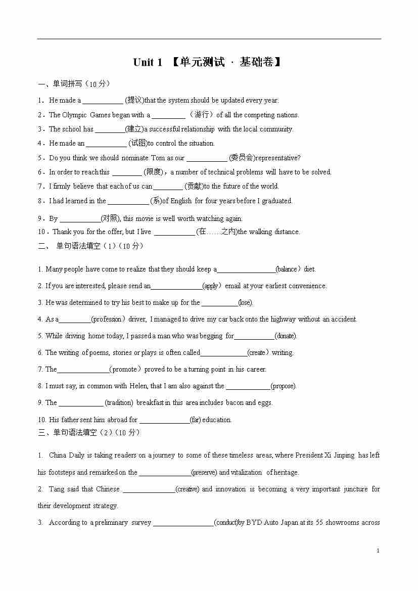 首页 > 全部 > 单元地区卷 > Unit 1 【单元测试 · 基础卷】-2024-2025学年高一英语单元速记•巧练(人教版2019必修第二册)(原卷版)