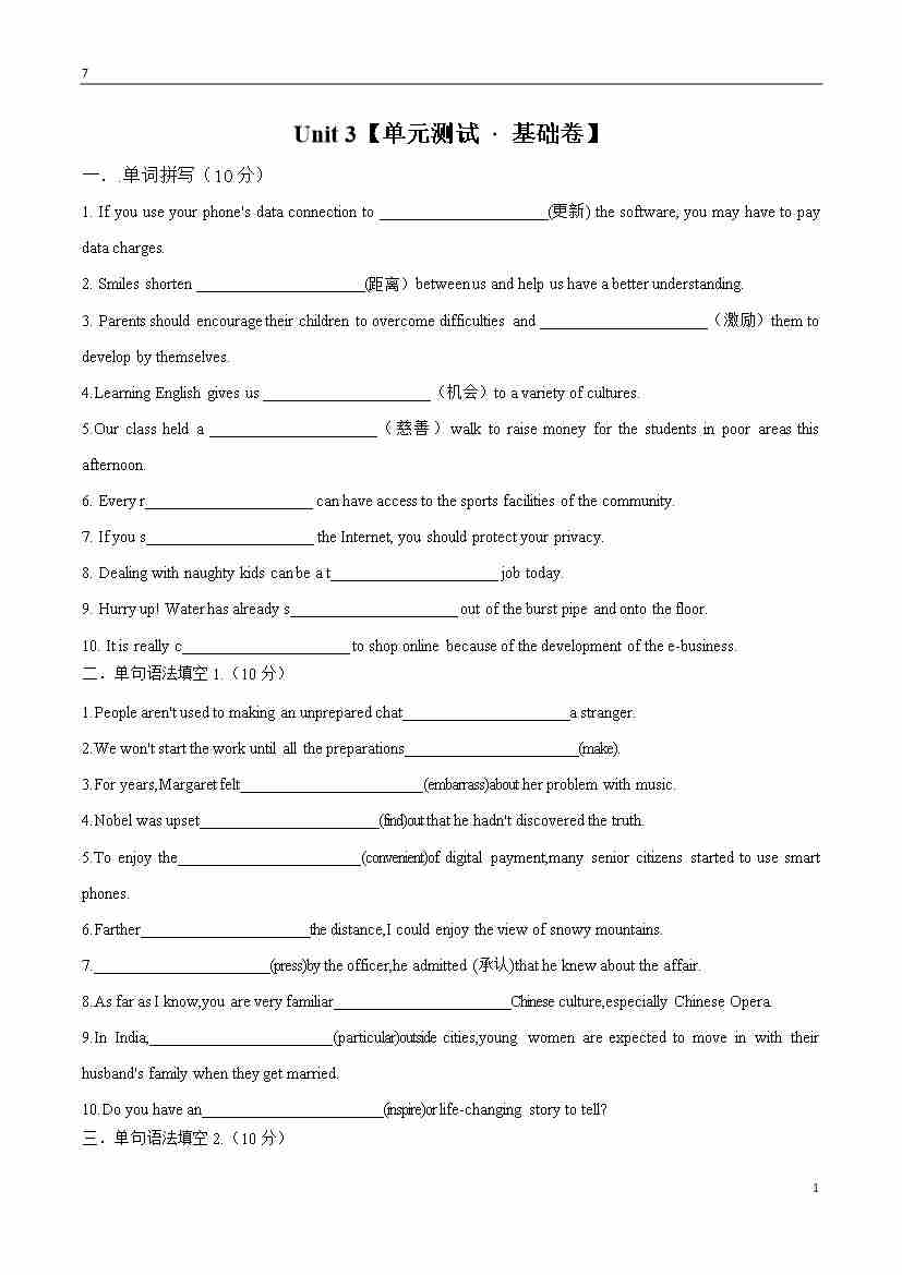 首页 > 全部 > 单元地区卷 > Unit 3【单元测试 · 基础卷】-2024-2025学年高一英语单元速记•巧练(人教版2019必修第二册)(原卷版)