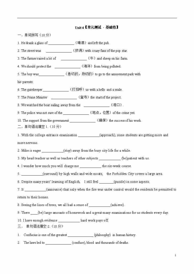 首页 > 全部 > 单元地区卷 > Unit 4 【单元测试 · 基础卷】-2024-2025学年高一英语单元速记•巧练(人教版2019必修第二册)(原卷版)