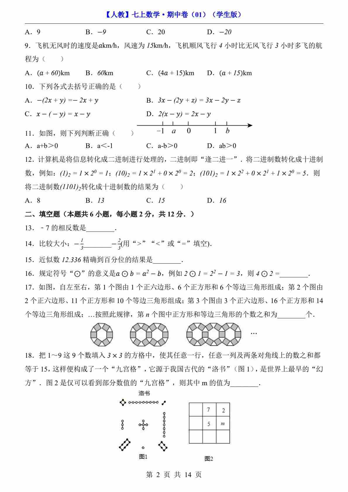 首页 > 全部 > 期中试卷 > 【人教】7上数学期中卷01【第1-4章】