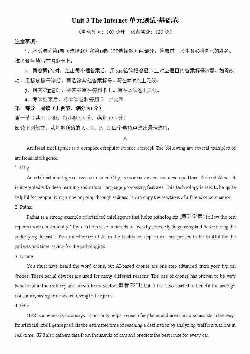 Unit 3 The Internet单元测试·基础卷(解析版)