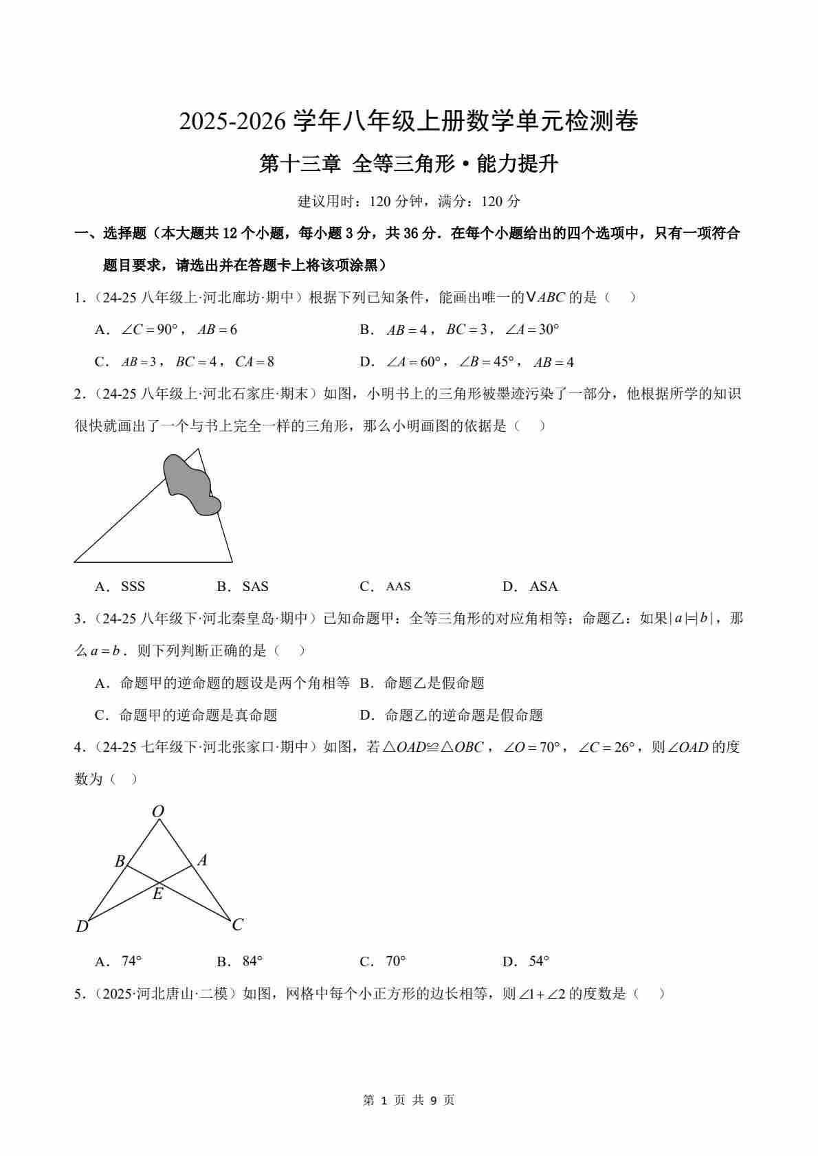 八上数学第13章 全等三角形测试·提升卷(考试版A4)