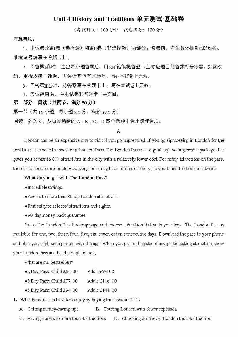 首页 > 全部 > 单元测试 > Unit 4 History and Traditions单元测试·基础卷(解析版)