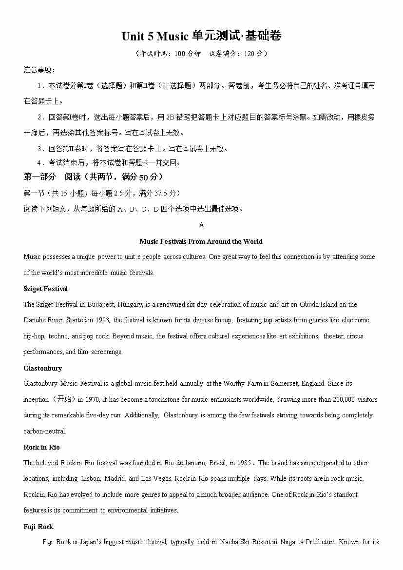 首页 > 全部 > 单元测试 > Unit 5 Music单元测试·基础卷(解析版)