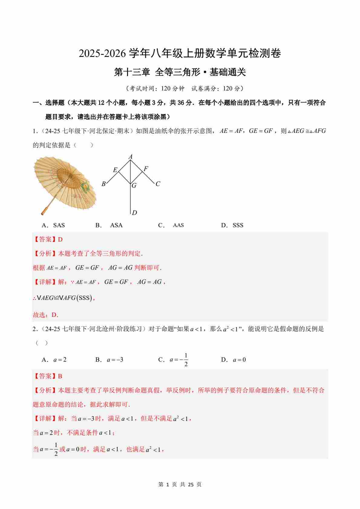 八上数学第13章 全等三角形测试·基础卷(解析版)