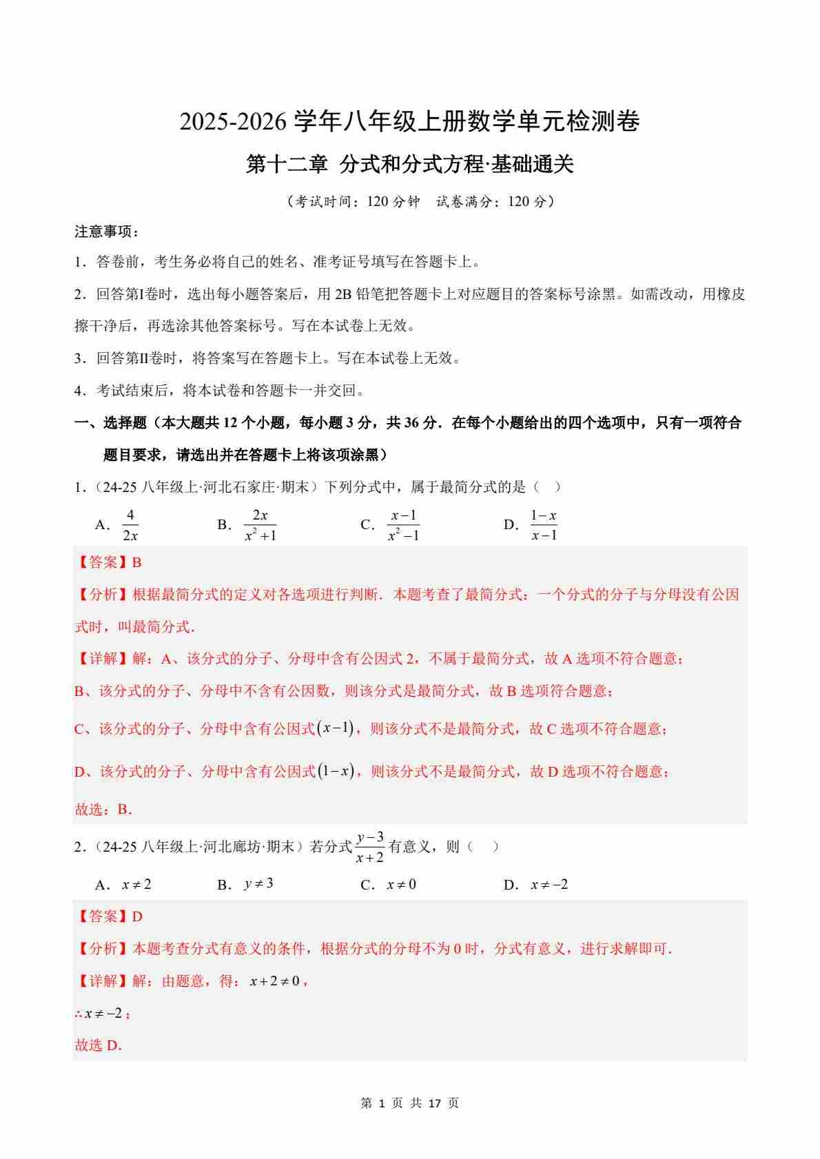 首页 > 全部 > 同步AB卷 > 八上数学第12章 分式和分式方程测试·基础卷(解析版)