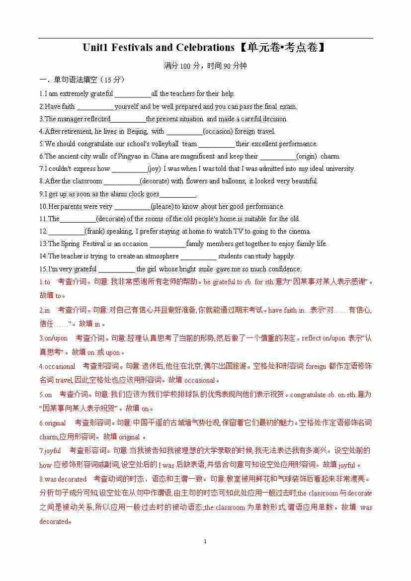 首页 > 全部 > 单元测试卷 > Unit1 Festivals and Celebrations【单元卷•考点卷】(解析版)