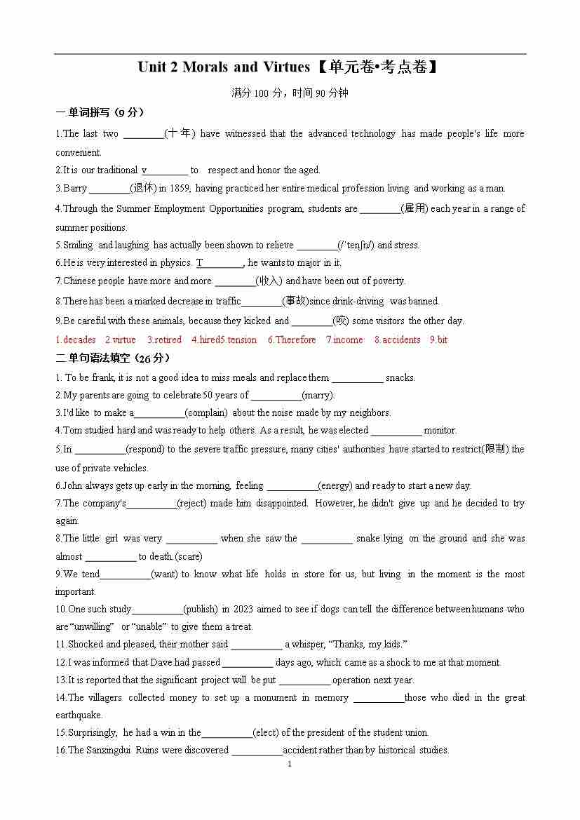 Unit 2 Morals and Virtues【单元卷•考点卷】(解析版)
