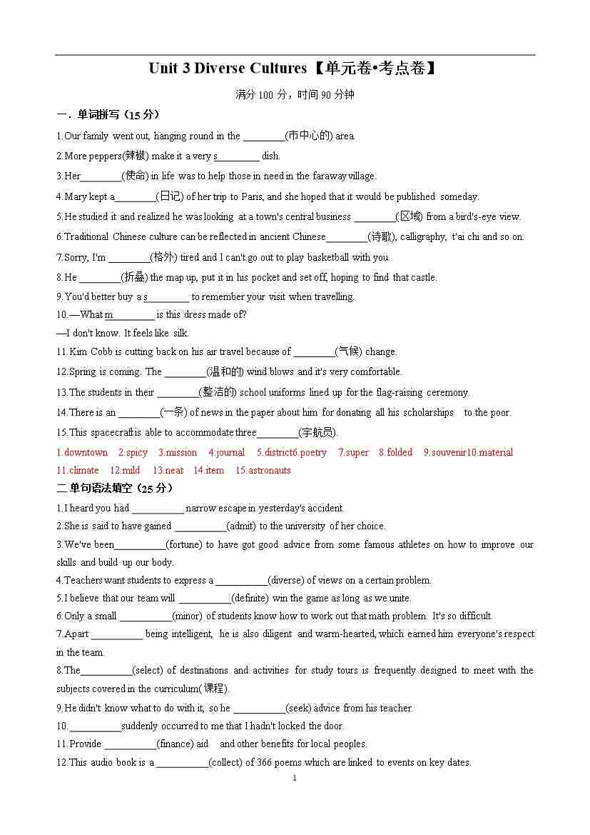 首页 > 全部 > 单元测试卷 > Unit 3 Diverse Cultures【单元卷•考点卷】(解析版)
