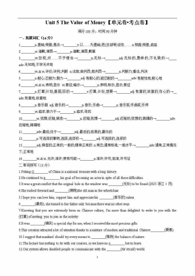 首页 > 全部 > 单元测试卷 > Unit 5 The Value of Money【单元卷•考点卷】(原卷版)