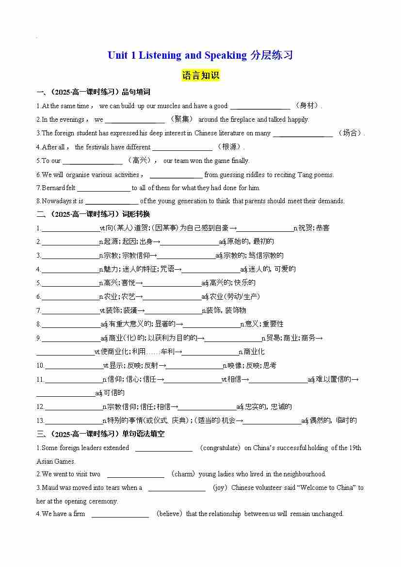 Unit 1 Listening and Speaking 分层练习(原卷版)--- 【上好课】2024-2025学年高一英语同步精品课堂(人教版2019必修第三册)