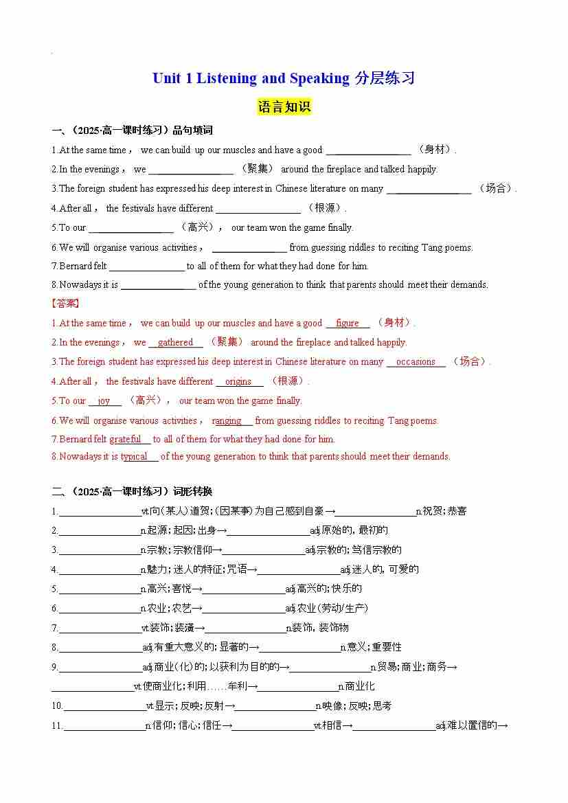 Unit 1 Listening and Speaking 分层练习(解析版)--- 【上好课】2024-2025学年高一英语同步精品课堂(人教版2019必修第三册)