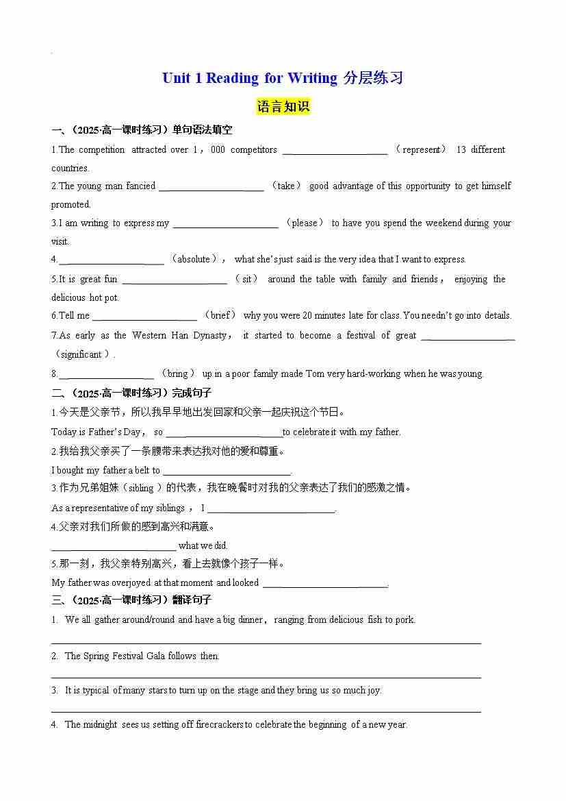 首页 > 全部 > 分层作业 > Unit 1 Reading for Writing 分层练习(原卷版)--- 【上好课】2024-2025学年高一英语同步精品课堂(人教版2019必修第三册)