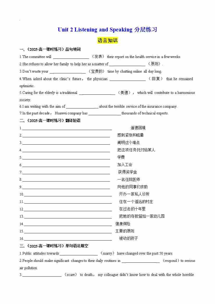 Unit 2 Listening and Speaking 分层练习(原卷版)--- 【上好课】2024-2025学年高一英语同步精品课堂(人教版2019必修第三册)