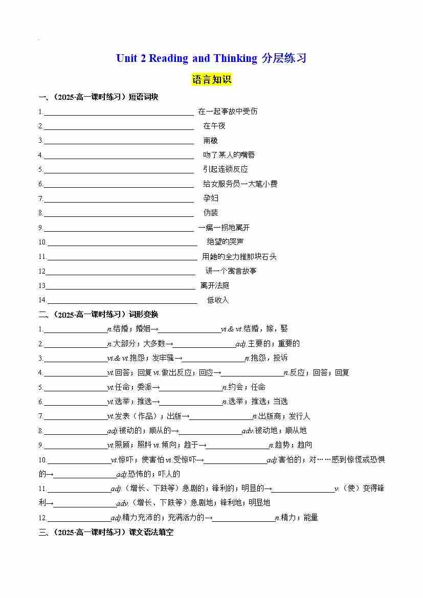 首页 > 全部 > 分层作业 > Unit 2 Reading and Thinking 分层练习(原卷版)--- 【上好课】2024-2025学年高一英语同步精品课堂(人教版2019必修第三册)