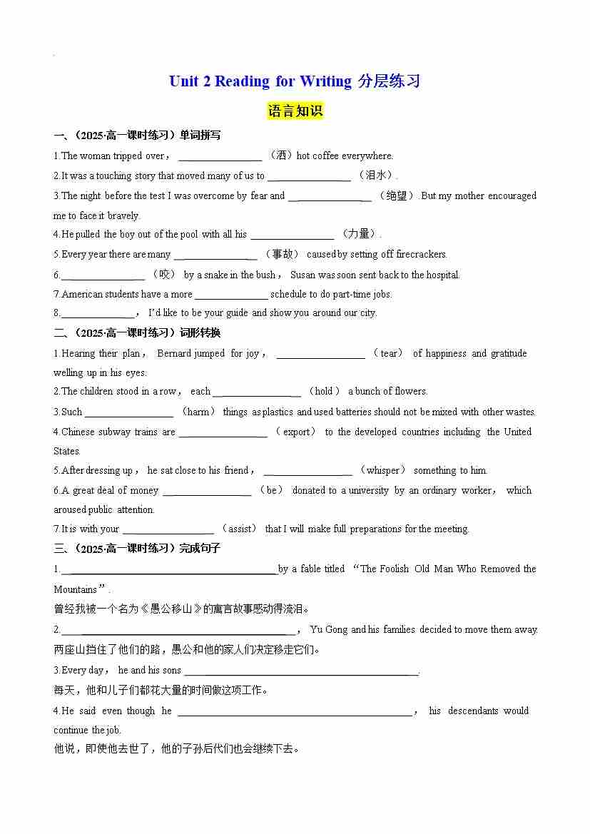 首页 > 全部 > 分层作业 > Unit 2 Reading for Writing 分层练习(原卷版)--- 【上好课】2024-2025学年高一英语同步精品课堂(人教版2019必修第三册)