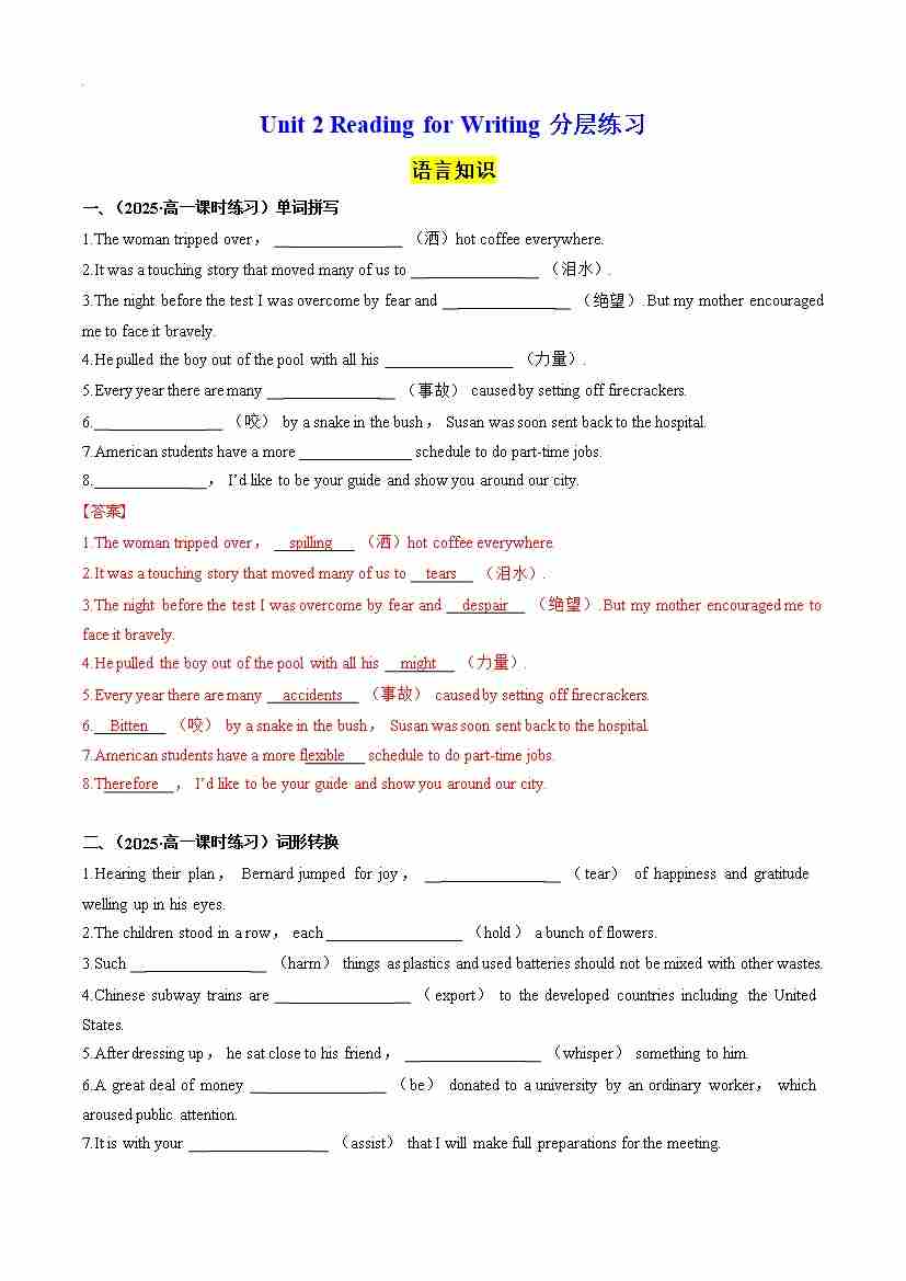 Unit 2 Reading for Writing 分层练习(解析版)--- 【上好课】2024-2025学年高一英语同步精品课堂(人教版2019必修第三册)