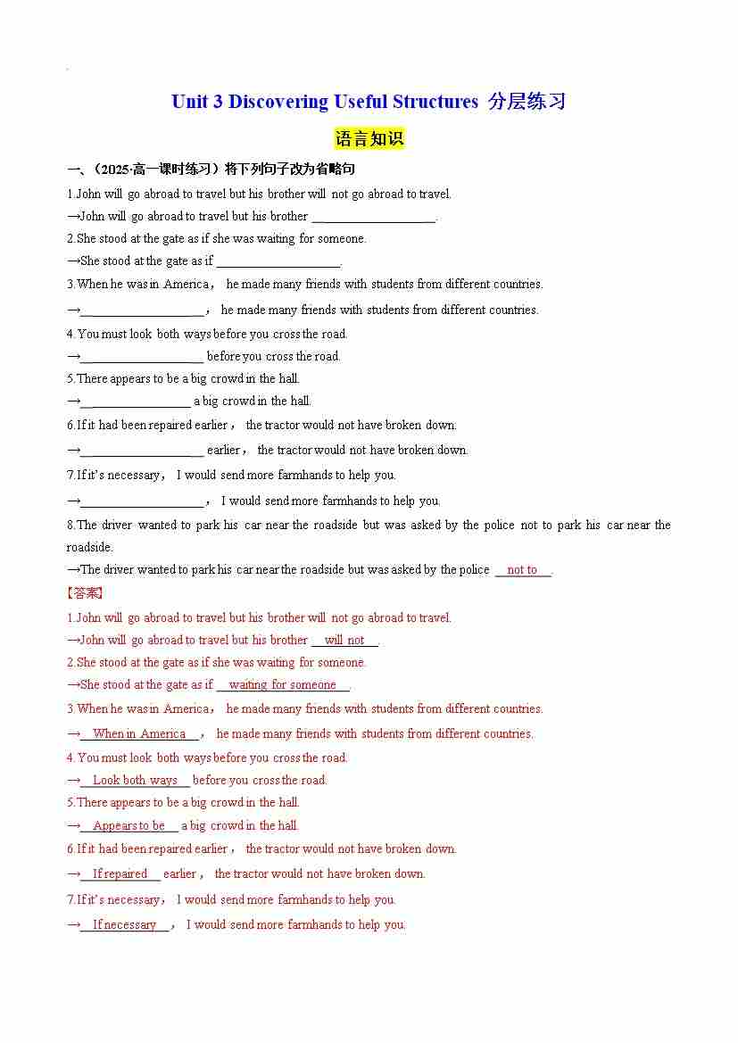 首页 > 全部 > 分层作业 > Unit 3 Discovering Useful Structures 分层练习(解析版)--- 【上好课】2024-2025学年高一英语同步精品课堂(人教版2019必修第三册)