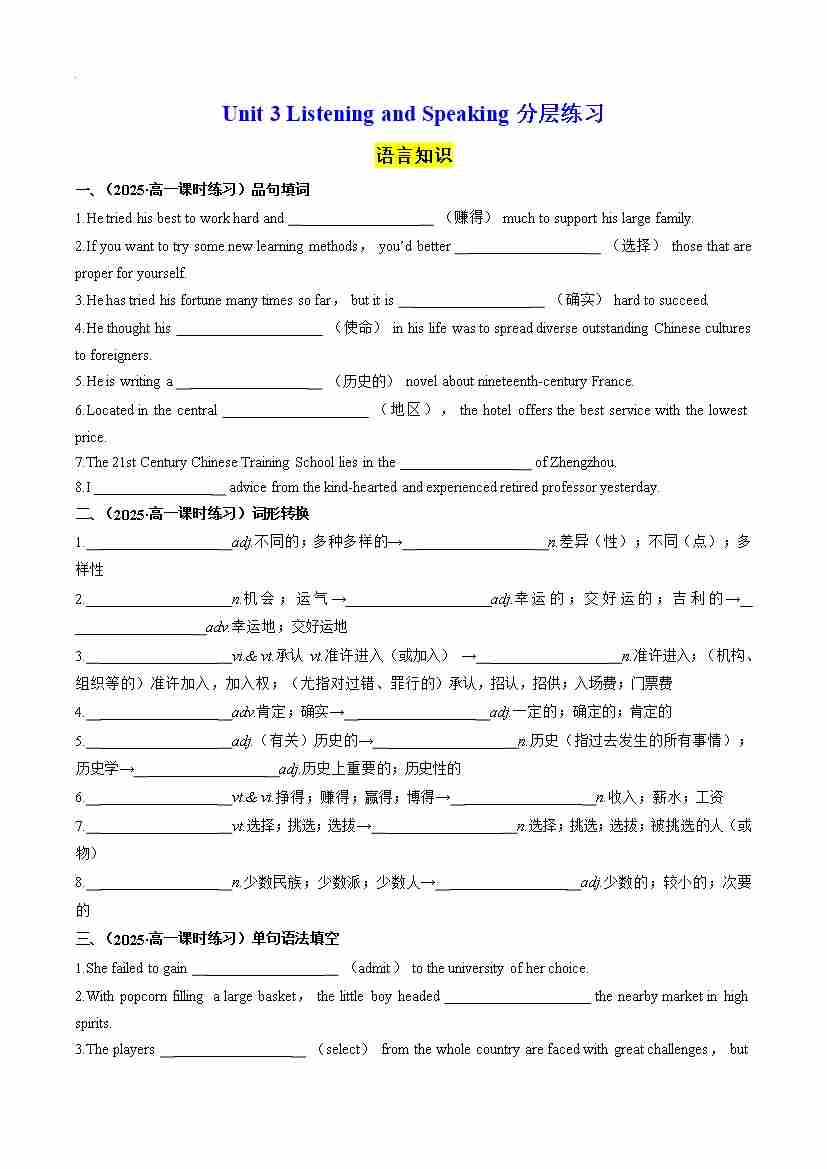 Unit 3 Listening and Speaking 分层练习(原卷版)--- 【上好课】2024-2025学年高一英语同步精品课堂(人教版2019必修第三册)