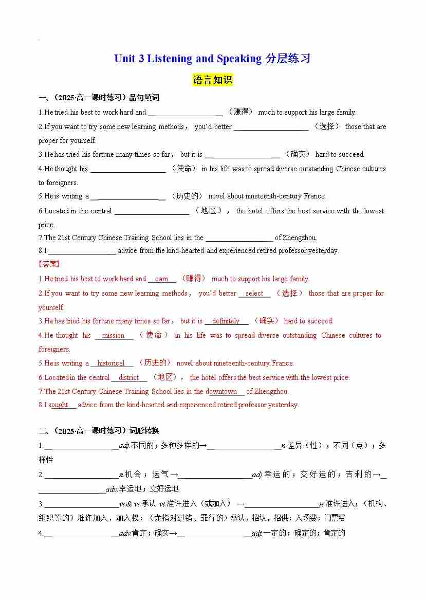 Unit 3 Listening and Speaking 分层练习(解析版)--- 【上好课】2024-2025学年高一英语同步精品课堂(人教版2019必修第三册)