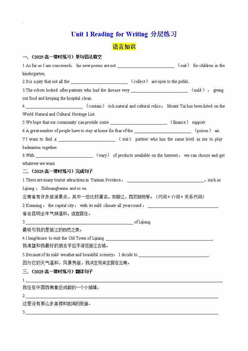 首页 > 全部 > 分层作业 > Unit 3 Reading for Writing 分层练习(原卷版)--- 【上好课】2024-2025学年高一英语同步精品课堂(人教版2019必修第三册)