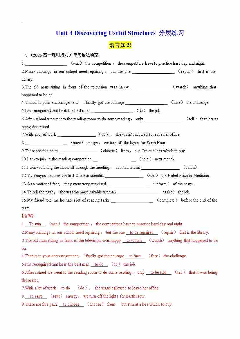 首页 > 全部 > 分层作业 > Unit 4 Discovering Useful Structures 分层练习(解析版)--- 【上好课】2024-2025学年高一英语同步精品课堂(人教版2019必修第三册)