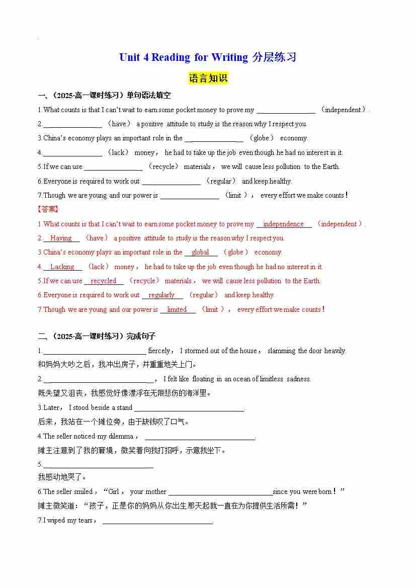 Unit 4 Reading for Writing 分层练习(解析版)--- 【上好课】2024-2025学年高一英语同步精品课堂(人教版2019必修第三册)