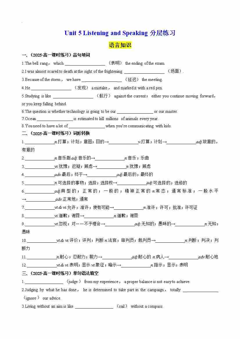 Unit 5 Listening and Speaking 分层练习(原卷版)--- 【上好课】2024-2025学年高一英语同步精品课堂(人教版2019必修第三册)