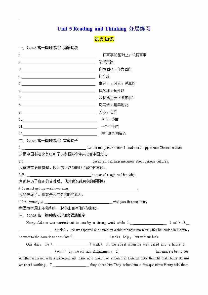 首页 > 全部 > 分层作业 > Unit 5 Reading and Thinking 分层练习(原卷版)--- 【上好课】2024-2025学年高一英语同步精品课堂(人教版2019必修第三册)
