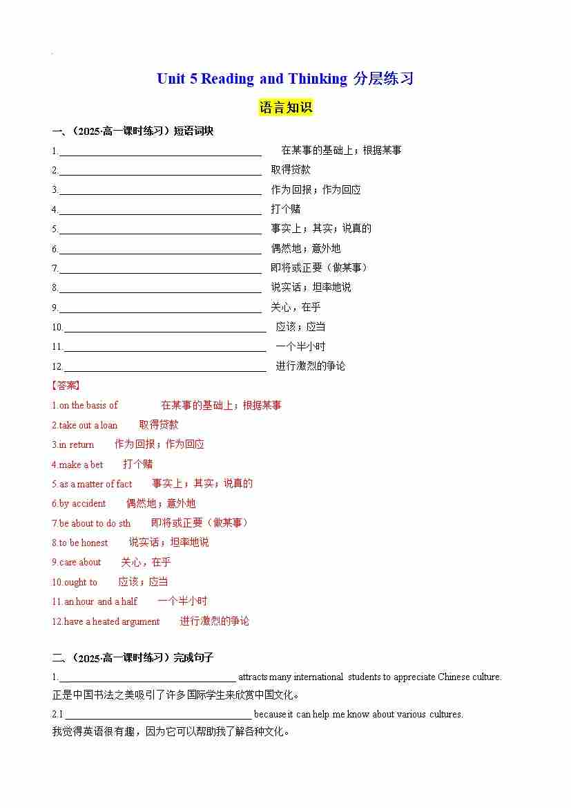 首页 > 全部 > 分层作业 > Unit 5 Reading and Thinking 分层练习(解析版)--- 【上好课】2024-2025学年高一英语同步精品课堂(人教版2019必修第三册)