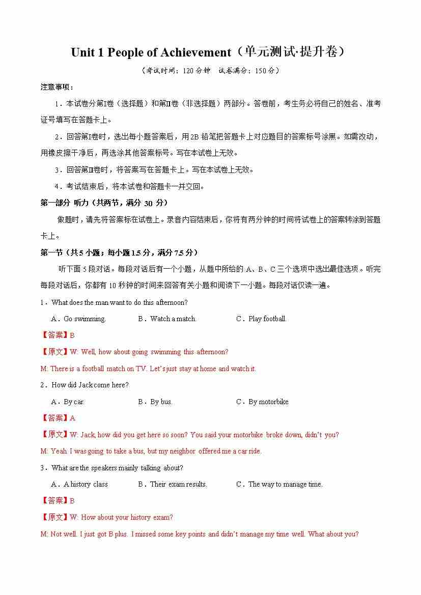首页 > 全部 > 单元测试 > Unit 1 People of Achievement(单元测试·提升卷)(教师版)