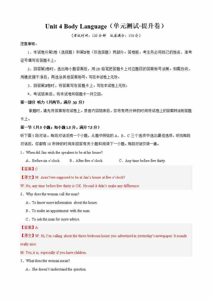 首页 > 全部 > 单元测试 > Unit 4 Body Language(单元测试·提升卷)(教师版)