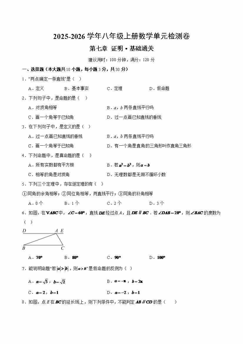 首页 > 全部 > 单元基础卷 > 八上数学第七章 证明测试·基础卷(考试版A4)
