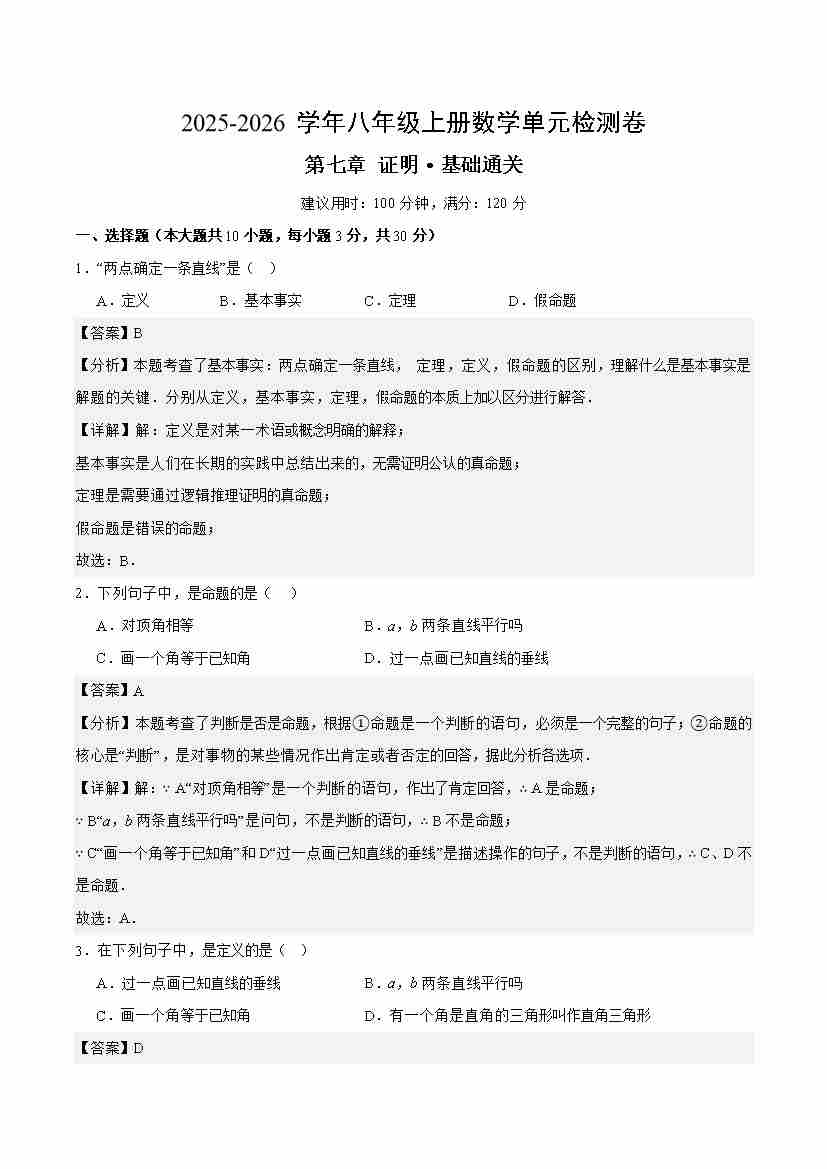 首页 > 全部 > 单元基础卷 > 八上数学第七章 证明测试·基础卷(解析版)