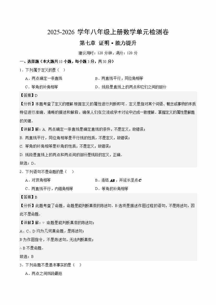 首页 > 全部 > 单元提升卷 > 八上数学第七章 证明测试·提升卷(解析版)