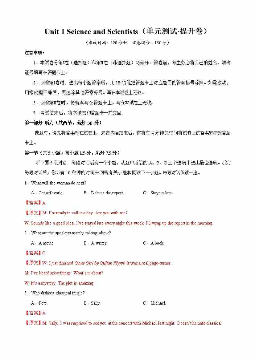 Unit 1 Science and Scientists(单元测试·提升卷)(教师版)
