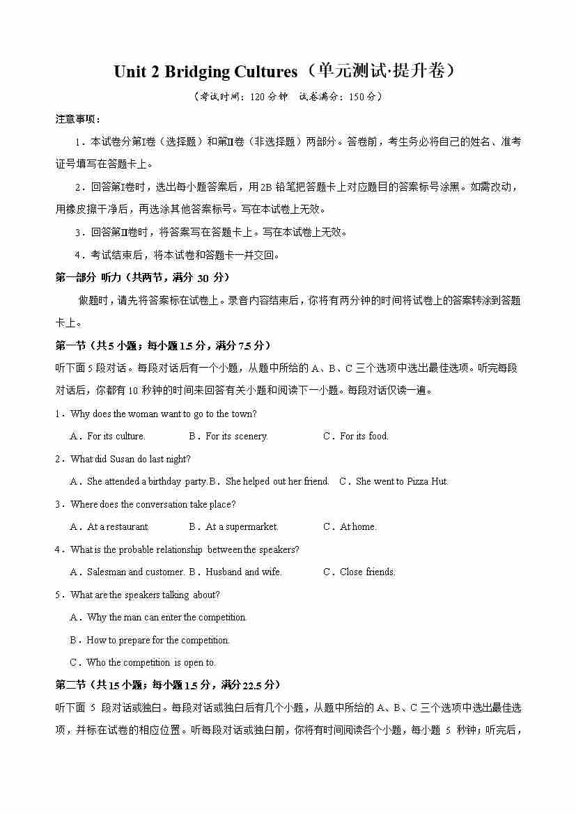 首页 > 全部 > 单元测试 > Unit 2 Bridging Cultures(单元测试·提升卷)(学生版)