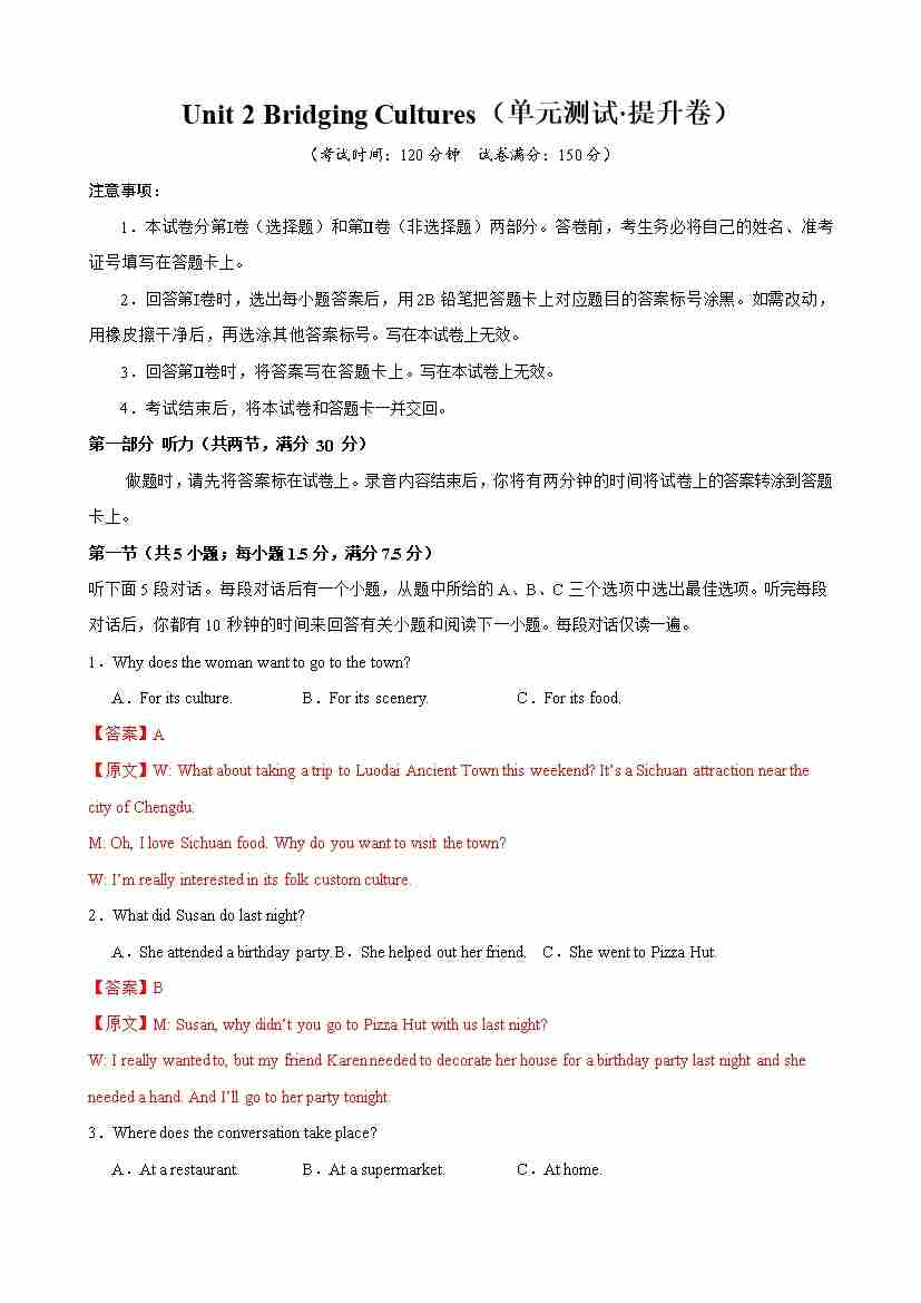 首页 > 全部 > 单元测试 > Unit 2 Bridging Cultures(单元测试·提升卷)(教师版)