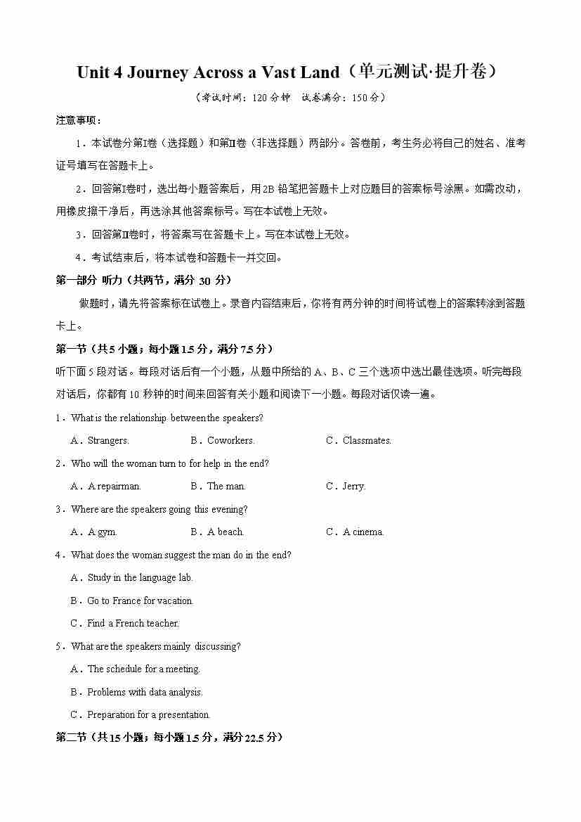 首页 > 全部 > 单元测试 > Unit 4 Journey Across a Vast Land(单元测试·提升卷)(学生版)