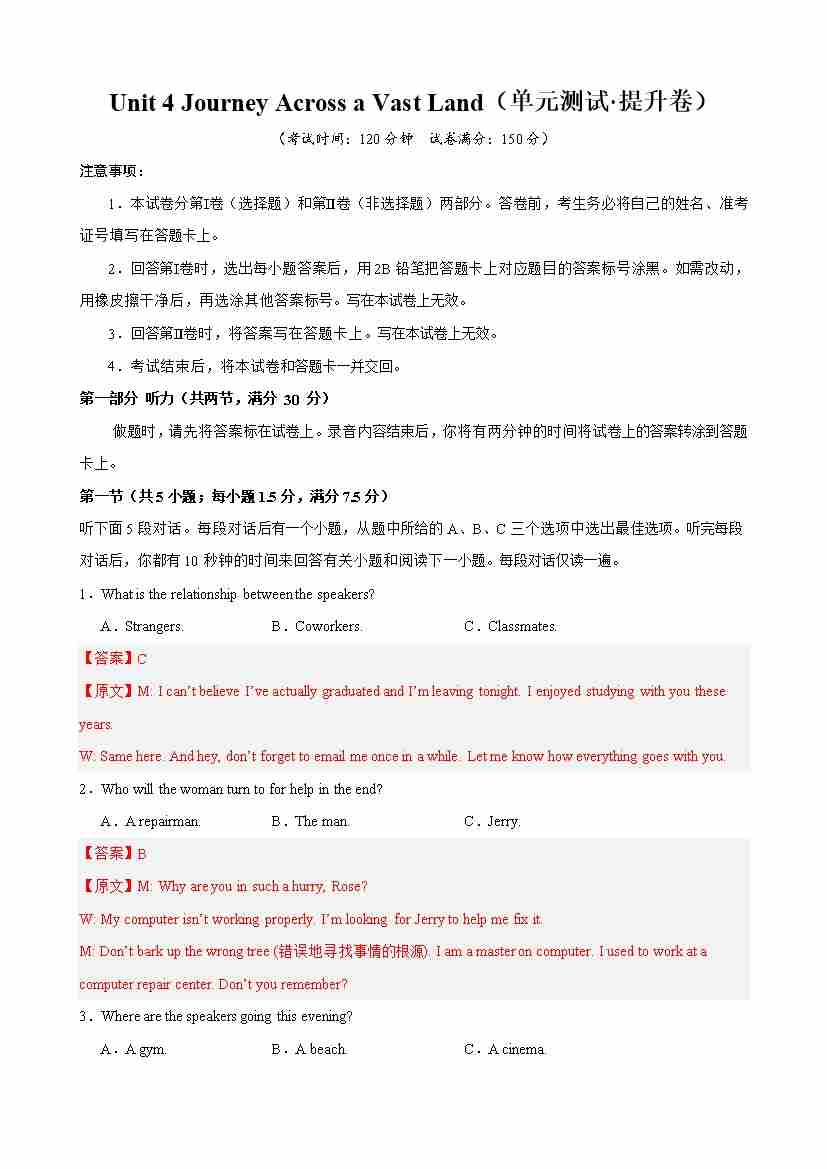 首页 > 全部 > 单元测试 > Unit 4 Journey Across a Vast Land(单元测试·提升卷)(教师版)