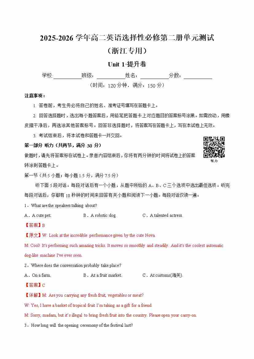 高二英语选择性必修第二册Unit 1单元测试·浙江专用(教师版)