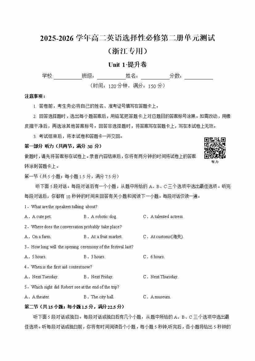 高二英语选择性必修第二册Unit 1单元测试·浙江专用(考试版A4)